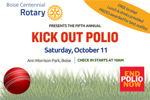Boise Centennial Rotary Club is excited to invite you to the 5th Annual Kick Out Polio Kickball Tournament! The purpose of this event is to mingle with Rotarians from around the Treasure Valley, raise funds and awareness about Rotary’s work to end polio, and have FUN!