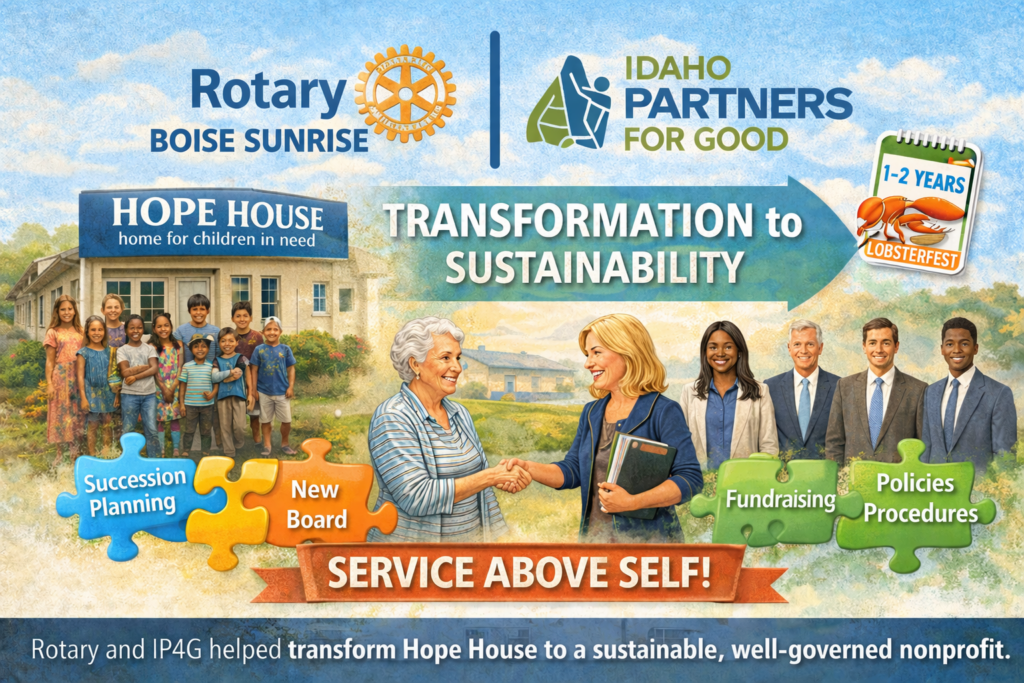 Boise Sunrise partnered with Idaho Partners for Good (IP4G) to address this challenging set of goals. It was clear to all involved that this would take 1-2 years and that we had to earn the trust of this founder, who held almost all the institutional knowledge as well as the vision for what she hoped HH would be going forward. In the end, a phased process was used so that achievable and sequential goals could be identified and met before moving to the next phase. Costs were well controlled along the way with members of Boise Sunrise offering assistance and organizational excellence pro-bono.